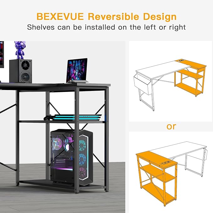 - Обръщащи се рафтове за съхранение: Рафтът на бюрото BEXEVUE може да се монтира отляво или отдясно според вашите навици на употреба и планиране на пространството, което максимално го приляга към вашето пространство.