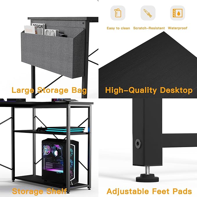 Геймърско бюро L-образно, 120x70 см, компютърно бюро с чанта за съхранение, офис бюро, малка маса за писане с големи обръщаеми рафтове за съхранение, работна станция за учене, игра, работа, домашен офис, черно